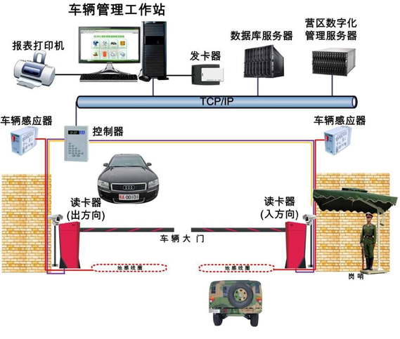 部隊營區車輛管理系統組成:車輛信息采集模塊(IC/ID、ETC不停車,車牌識別系統可選),出入控制器,道閘系統,車輛檢查器,語音顯示屏系統。